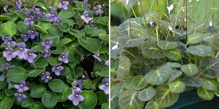 Saintpaulia pendula (left) is one of the so-called trailing saintpaulias that has multiple stems on each plant; Streptocarpus beampingaratrensis, a Madagascan species, has a similar stem and leaf habit, but the flowers and seed pods ally it to the Streptocarpella group in the genus Streptocarpus. Genetic analysis has shown that historical Saintpaulia species belong within the genus Streptocarpus, in subgenus Streptocarpella.