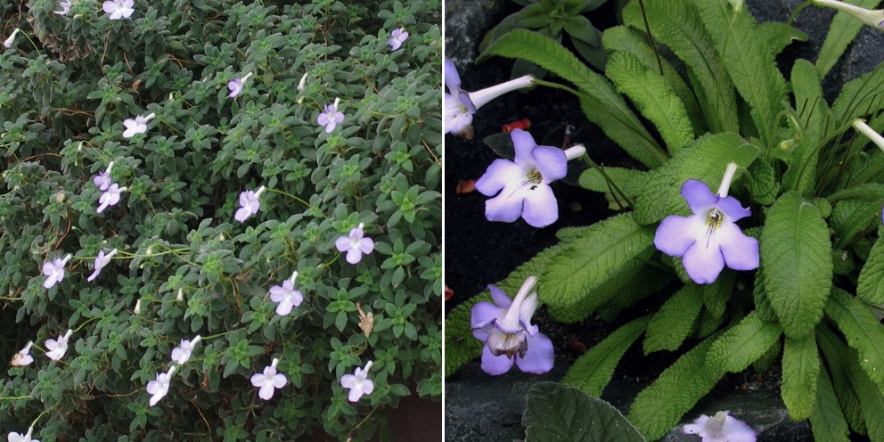Streptocarpus saxorum (left) is in the traditional Streptocarpella group, while Streptocarpus formosus is in the Streptocarpus group. The leaf and stem morphology is very different, with S. saxorum producing stems and conventional leaves, and S. formosus producing long strap-like leaves from the plant base.