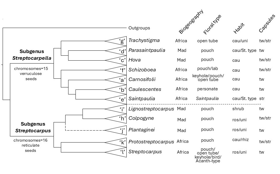Phylogenetic relationships of the subgenera and sections of genus Streptocarpus (adapted from Nishi et al., 2015). The biogeography, floral types, habit and capsule characters are shown in columns to the right. The broken line at the base of the Section Plantagenei indicates that this relationship is poorly supported. The letters a-k next to the section names indicates the order in which the Sections are described hereafter. Mad =Madagascar, cau = caulescent, lab = labellanthus, rhiz = rhizomatous, ros = rosulate, St. = Saintpaulia; str = straight, tw = twisted, uni = unifoliate.