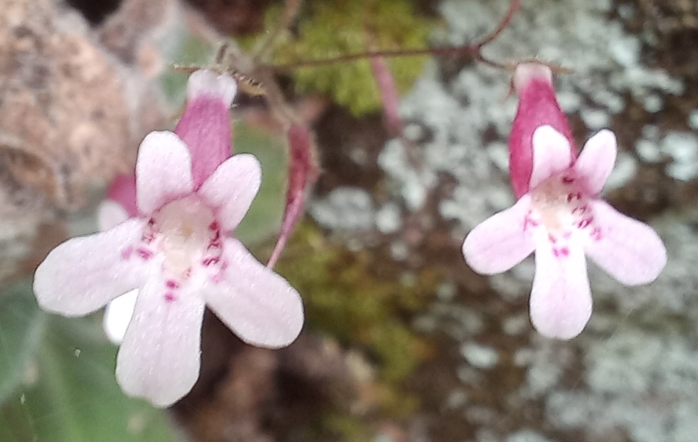 Streptocarpus rhodesianus ssp. rhodesianus occurs in Zambia, the Katanga Province of the Congo and eastern Moxico Province of Angola. Its grows in the shelter of outcrops on moss and lichen covered rocks and on mountainsides. Its rosette of leaves (up to 200 x 190 mm, mostly smaller) has a flannely, greyish green appearance and the plant appears to have good drought resistance if gauged by the glandular hairs found on its leaves, stems and flowers. These hairs allow the capture of moisture from mists and clouds. The flowers are small (7-10 mm long), dull purple to wine red with the inside of the corolla lobes white with wine red blotches and two rows of hairs on the lower corolla tube. The hairiness reminds one of the Angolan species, Streptocarpus huamboensis which also has hairs all over the plant.