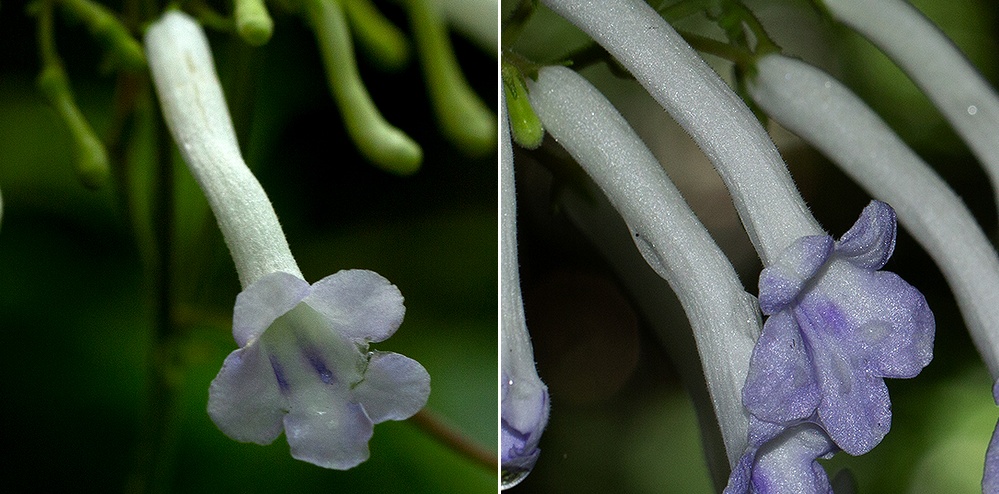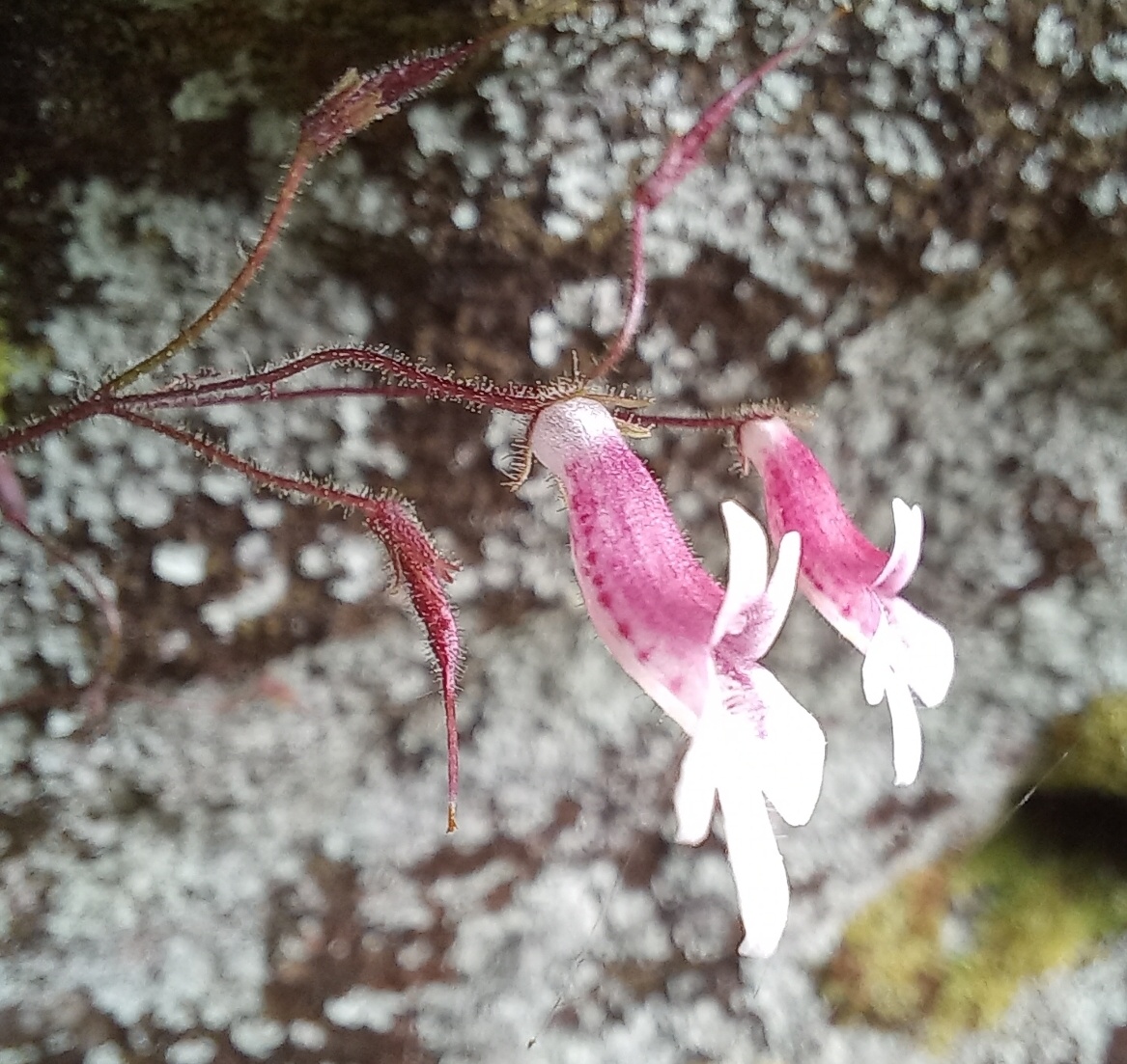 As the pictures show, it grows close to succulent aloes, that are extremely drought tolerant. It has up to five leaves (130 x 55 mm) and is a typical small rosulate species. Leaf, all stalks and flowers are covered in hairs to reduce moisture loss and to capture moisture from high altitude mists. Its flowers are short (corolla 9-10 mm) with very reduced corolla lobes and are pale creamy white with reddish-violet stripes on the corolla base. This species could be an interesting horticultural subject, but it’s unusual natural environment may make it difficult. In any event, it is not in cultivation at present.