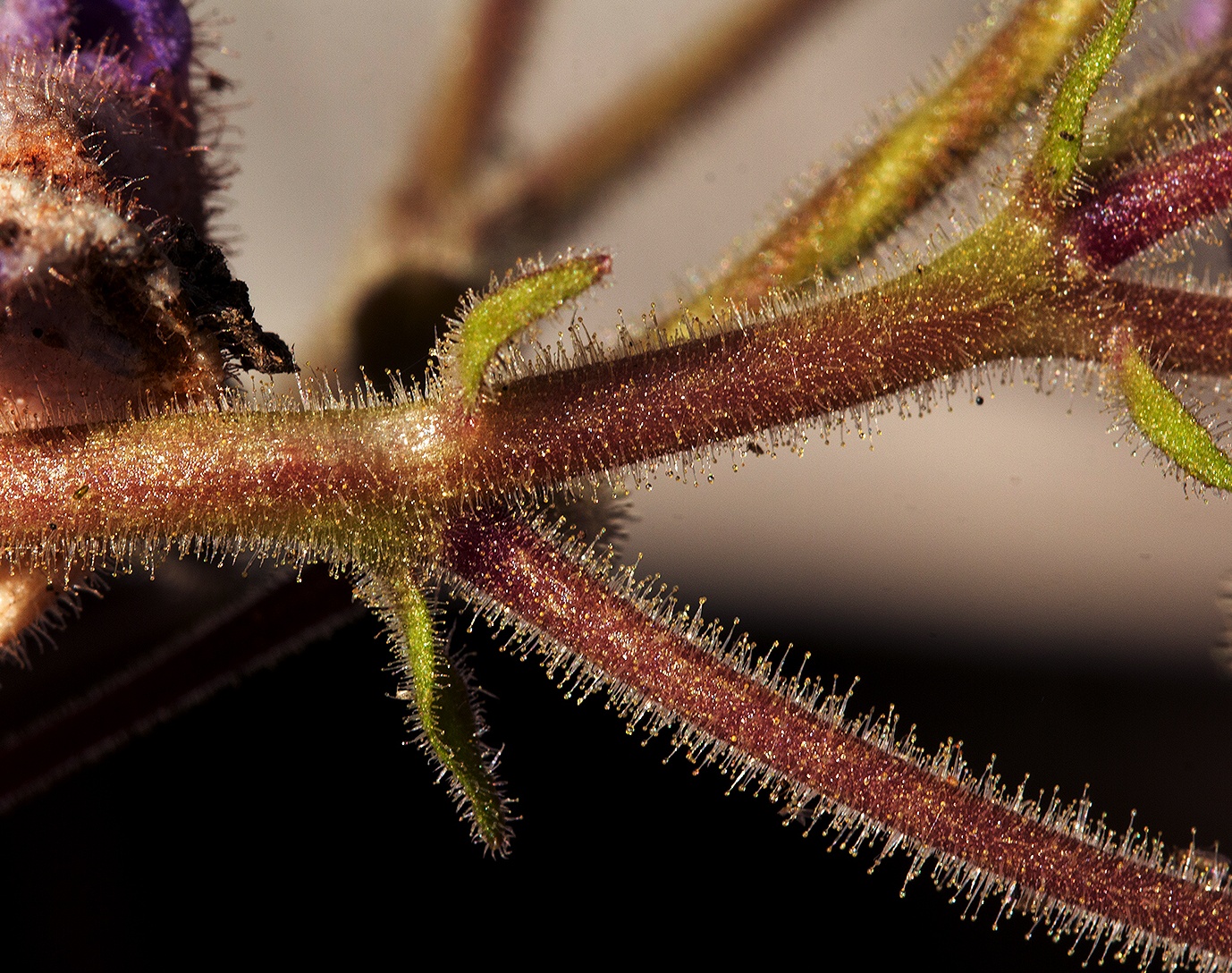- The inflorescence stems with dense glandular trichomes (hairs), which probably make these stems sticky