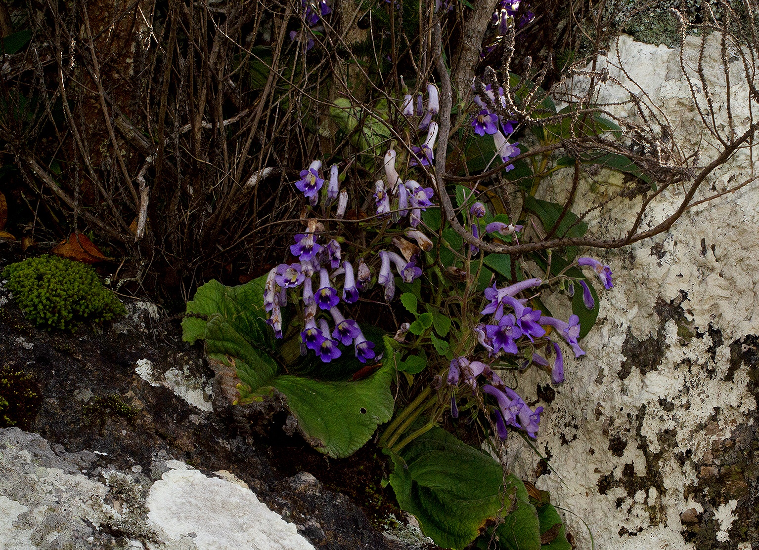 Streptocarpus monophyllus is a large monocarpic, unifoliate species (28 x 30 cm) with large, mauve flowers (40-45 mm long), deeper mauve in the throat, lighter on the outside. Streptocarpus monophyllus is found on the east facing cliffs of the southern highlands of Angola, in the vicinity of Lubango at altitudes of 1700 – 2200 metres. One gorge in which they occur lies next to the spectacular Leba Pass, leading down to the Namib desert and the Atlantic Ocean some 200 km to the west.