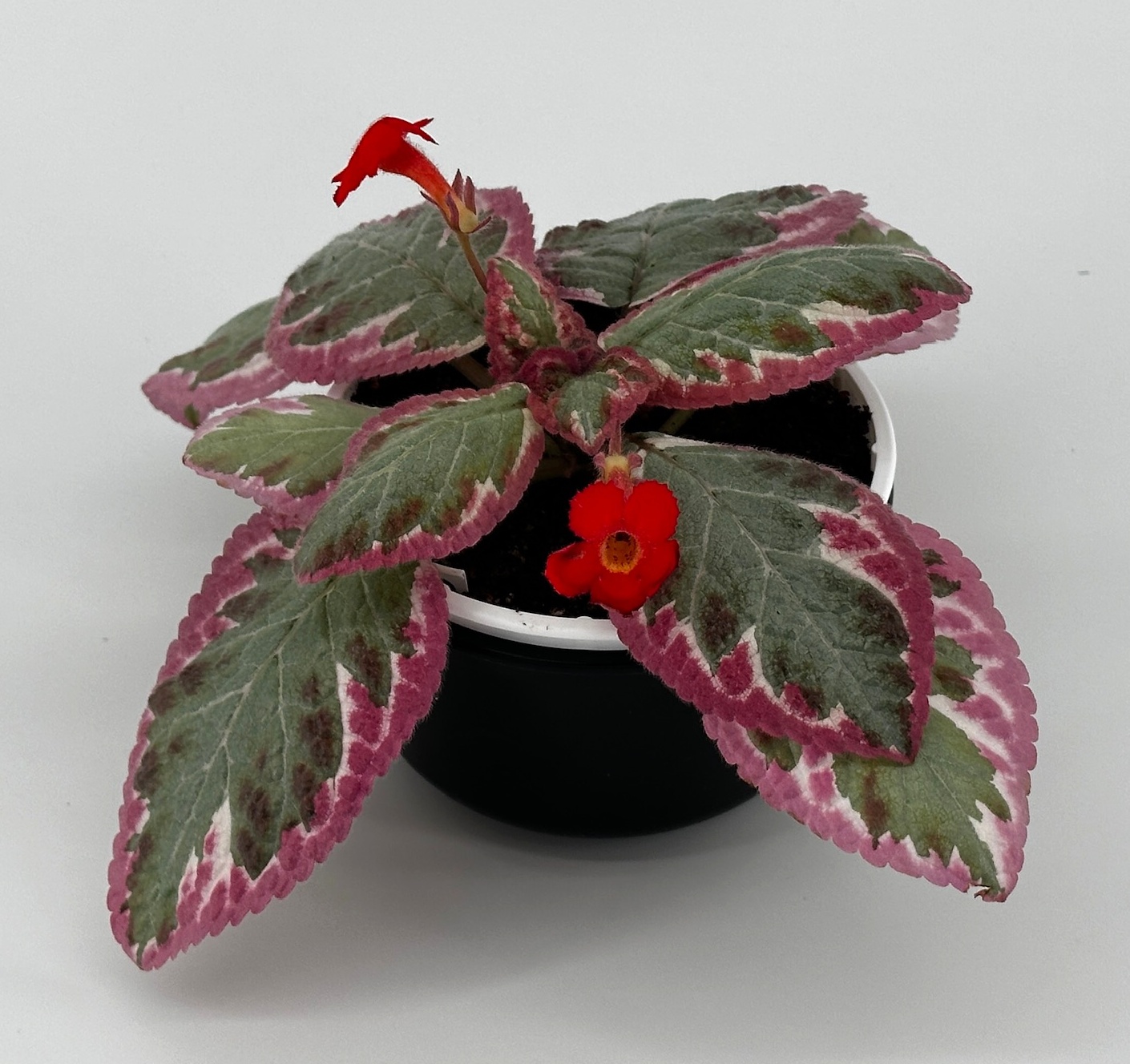 Episcia ‘Cleopatra’ is a classic cultivar, introduced in 1963 as a sport of E. ‘Frosty’. Its pale pink, green and white leaf colors were a sensation, and it has been widely grown ever since. Flowers, rarely produced, are bright red. Many look-alike cultivars have been produced, with paler or darker foliage colors, or variations on the pattern.