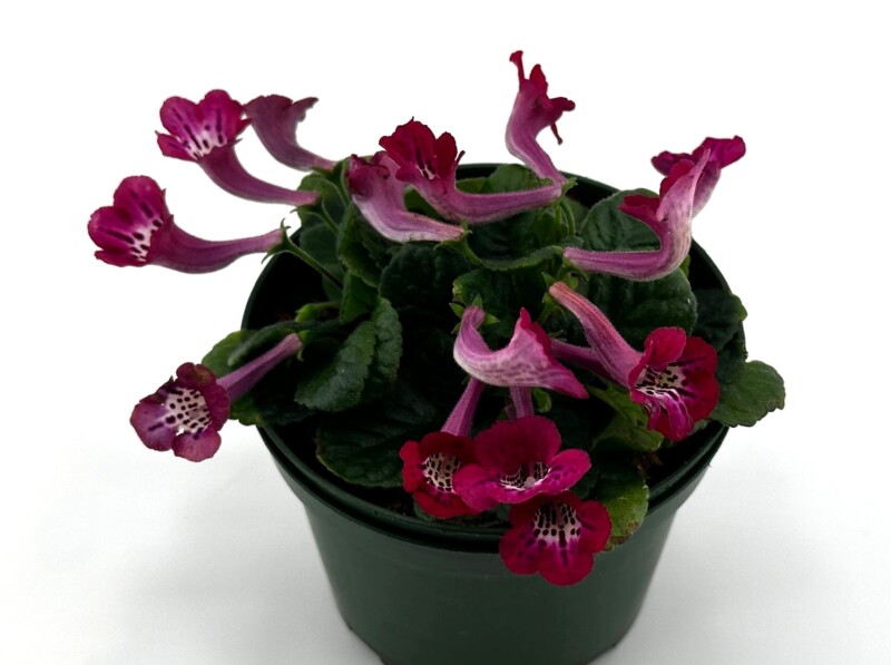 Sinningia ‘SimSim Selaviem’ is often touted as the first “true red” micro miniature Sinningia. Its beautiful color is set off by the white spotted throat.