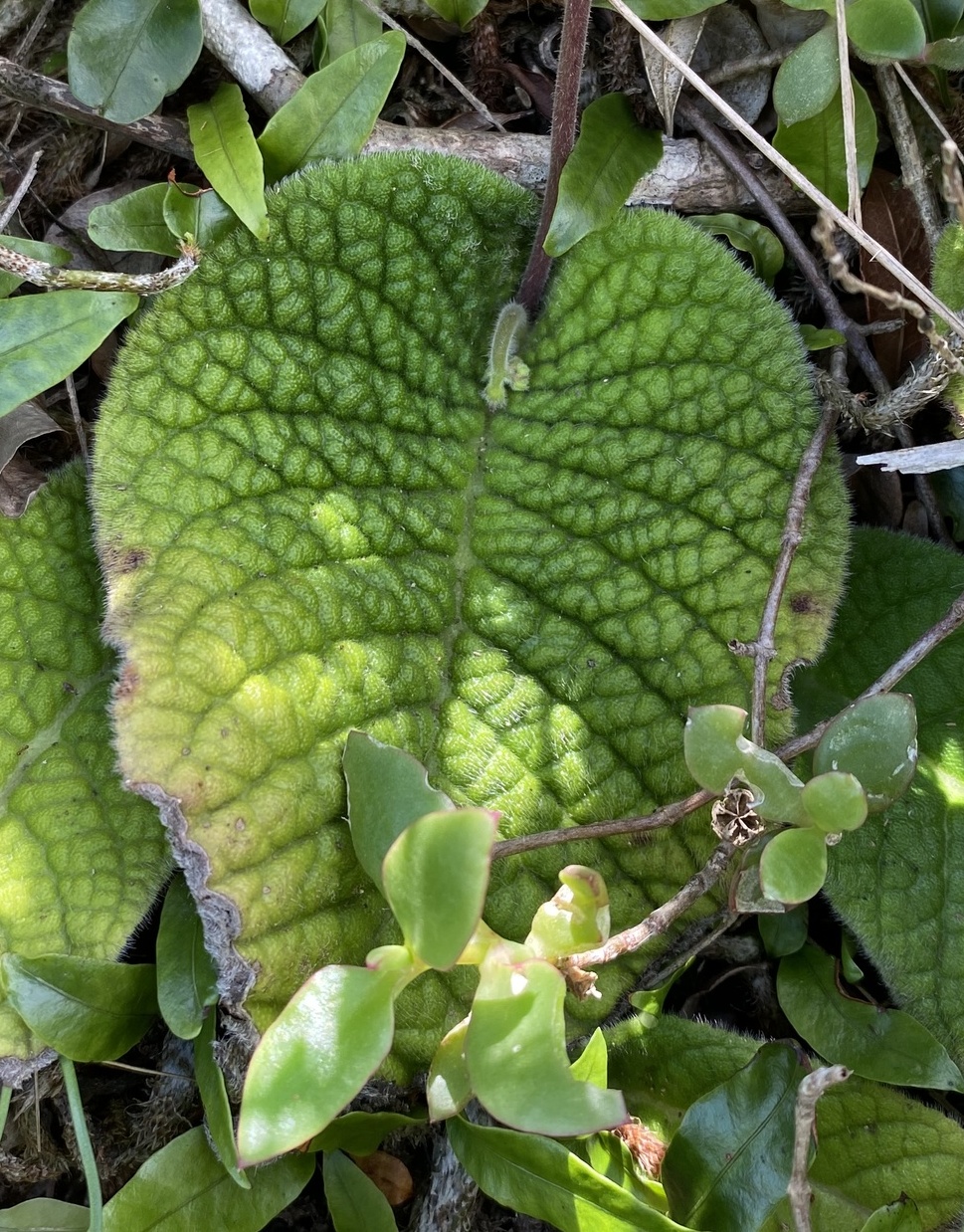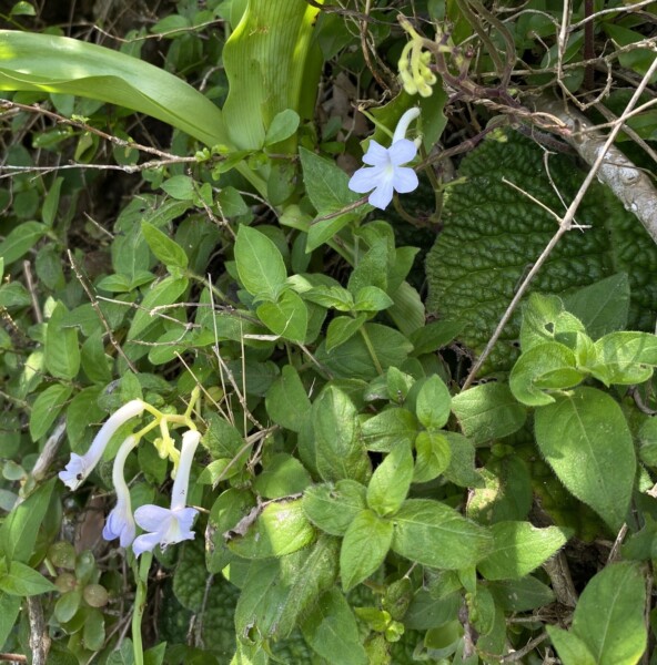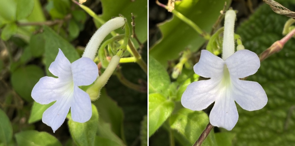 The range of Streptocarpus confusus ssp. lebomboensis is different than that of S. confusus ssp. confusus, and it occurs more easterly from northern KwaZulu Natal Province, South Africa, into Eswatini and Mozambique. The name of the subspecies derives from the Lebombo Mountains where is grows in semi-shade often on very exposed cliffs and rock faces, which are covered in otherwise succulent vegetation. Streptocarpus confusus ssp. lebomboensis has larger pale mauve keyhole shaped flowers (c. 35 – 55 mm long) and has a forked stigma. This form of the species is usually seen with very bullate leaves, as can be seen in the photos.