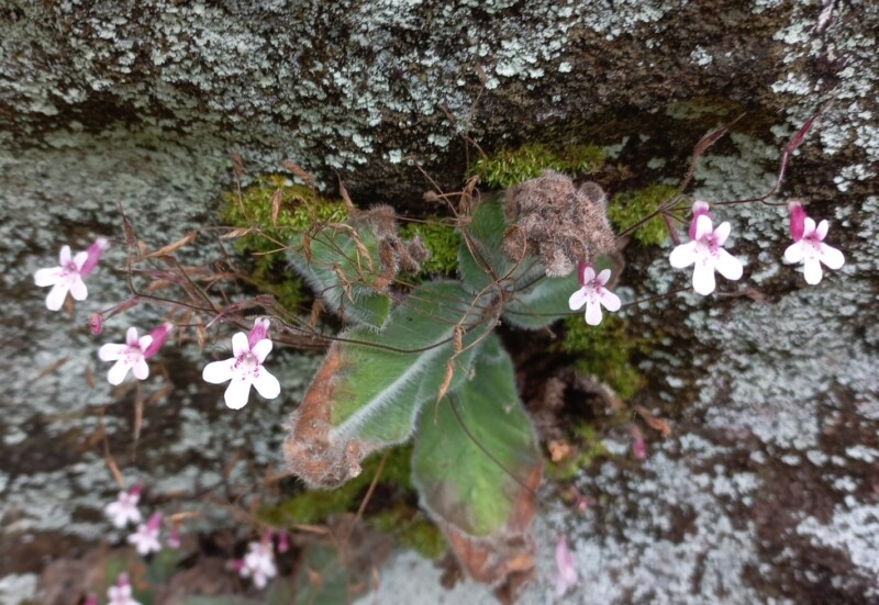 Streptocarpus rhodesianus ssp. rhodesianus occurs in Zambia, the Katanga Province of the Congo and eastern Moxico Province of Angola. Its grows in the shelter of outcrops on moss and lichen covered rocks  and on mountainsides. Its rosette of leaves (up to 200 x 190 mm, mostly smaller) has a flannely, greyish green appearance and the plant appears to have good drought resistance if gauged by the glandular hairs found on its leaves, stems and flowers. These hairs allow the capture of moisture from mists and clouds. The flowers are small (7-10 mm long), dull purple to wine red with the inside of the corolla lobes white with wine red blotches and two rows of hairs on the lower corolla tube. The hairiness reminds one of the Angolan species, Streptocarpus huamboensis which also has hairs all over the plant.