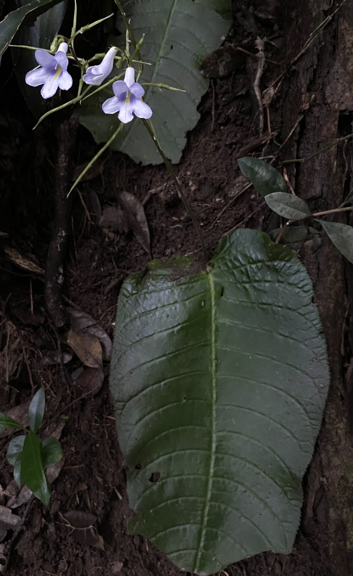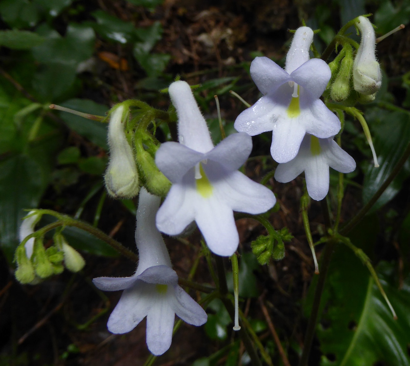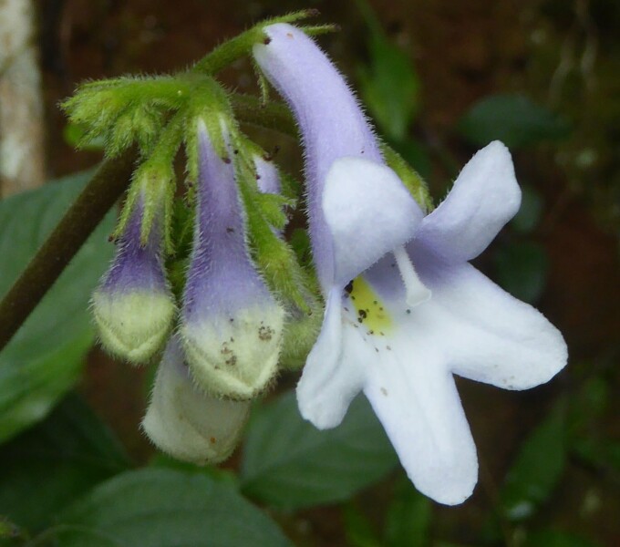 Streptocarpus saundersii is a monocarpic unifoliate with a fairly large (370 x 260 mm), dark green leaf, underside often beetroot red. It produces numerous flowers, many opening at the same time to give an attractive floral display. The flowers are tube shaped, variable in length (26 – 40 mm), and colour (white to pale violet) with darker violet on the bottom of the corolla floor with a long conspicuous yellow stripe. It grows on moss covered rocks or steep embankments in forest, from Inanda inland from the coastal city of Durban towards Pietermaritzburg to Nkandla in the north (KwaZulu Natal Province, South Africa).