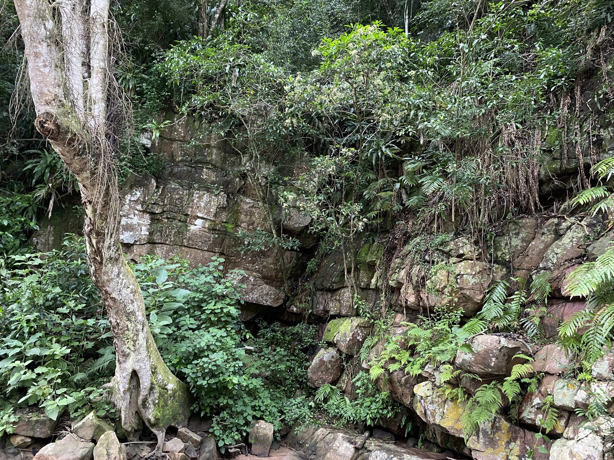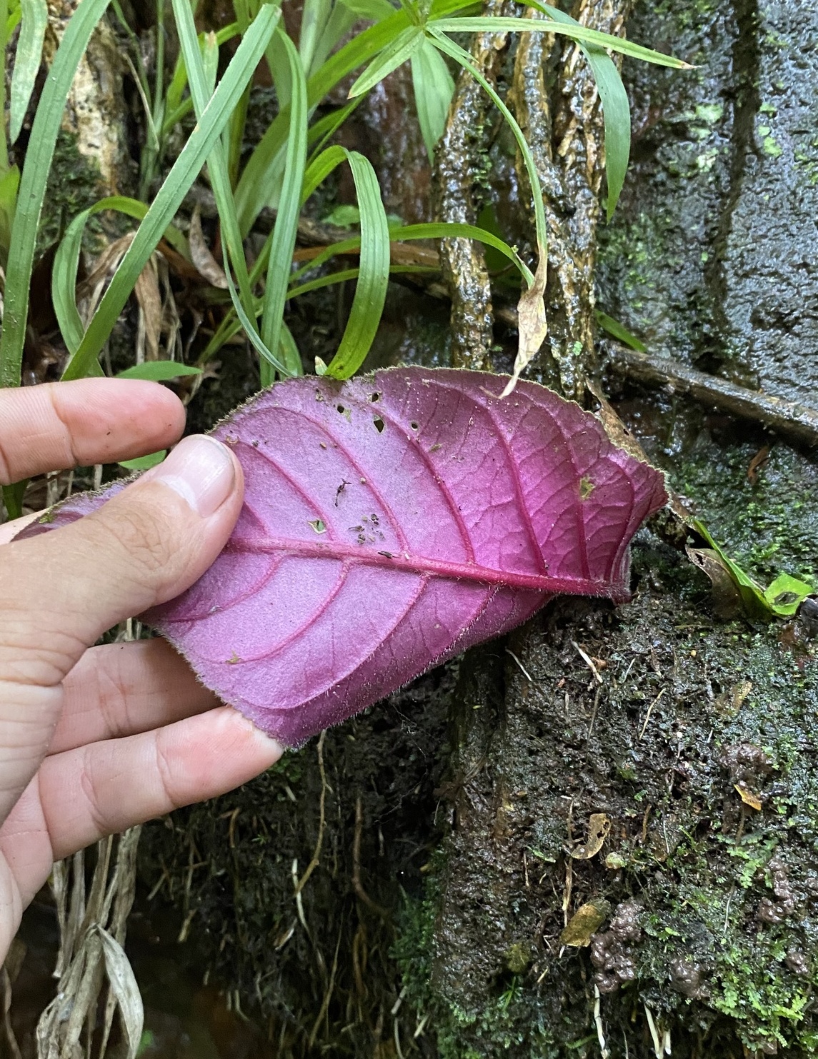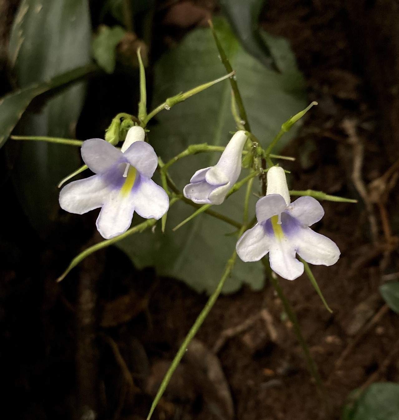 Streptocarpus saundersii is a monocarpic unifoliate with a fairly large (370 x 260 mm), dark green leaf, underside often beetroot red. It produces numerous flowers, many opening at the same time to give an attractive floral display. The flowers are tube shaped, variable in length (26 – 40 mm), and colour (white to pale violet) with darker violet on the bottom of the corolla floor with a long conspicuous yellow stripe. It grows on moss covered rocks or steep embankments in forest, from Inanda inland from the coastal city of Durban towards Pietermaritzburg to Nkandla in the north (KwaZulu Natal Province, South Africa).