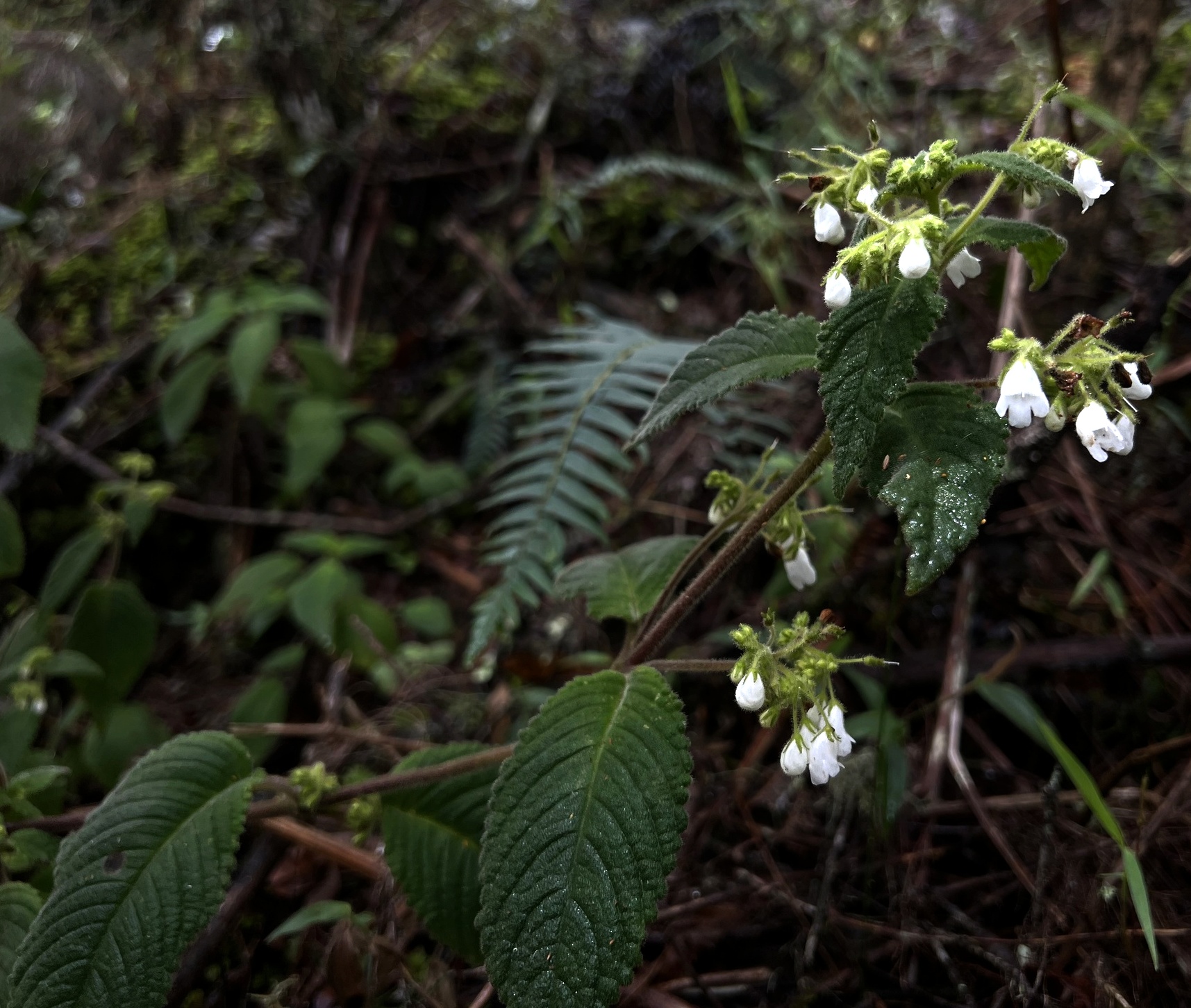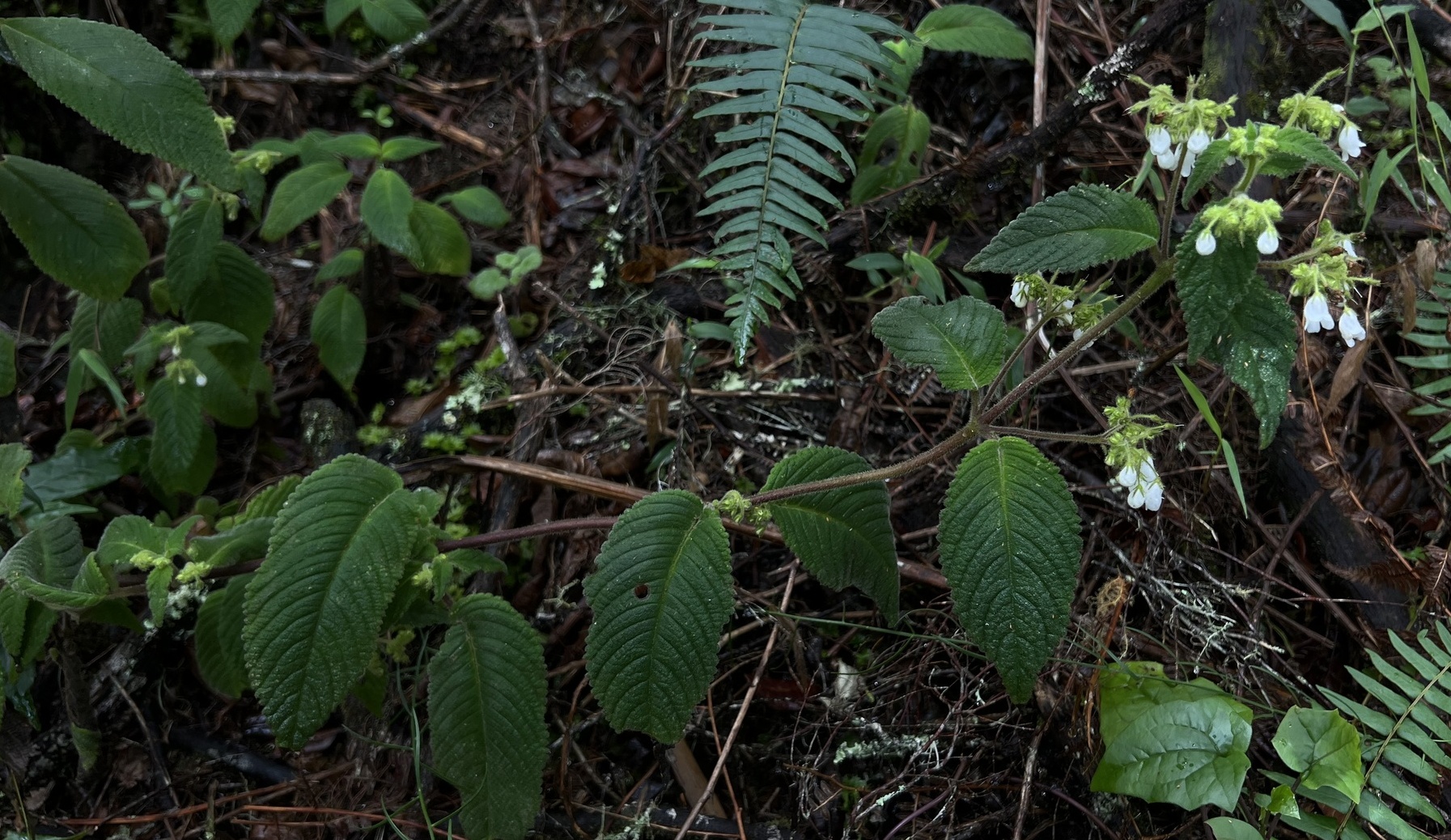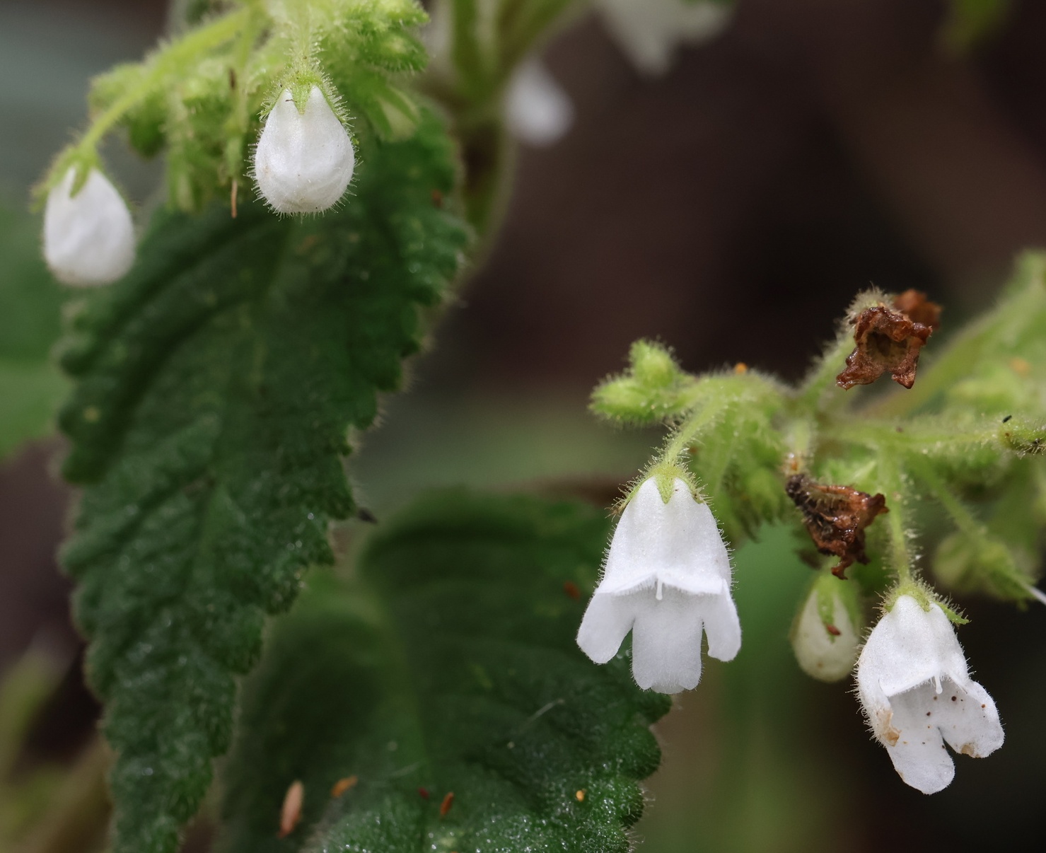 Streptocarpus schliebeni is again an oddball species which has a herbaceous stem like members of subgenus Streptocarpella do, but DNA analysis indicates that it falls into this section. It produces a soft stem up to a length of up to 1 m, with inflorescences that develop in the leaf axils. Each inflorescence bears so many flowers that it appears to then limit the growth of the terminal stem. Flowers are small, pouch shaped and white (c. 12 mm long). It grows only in the Nguru Mountains in Tanzania, a habitat often shared with African violets.